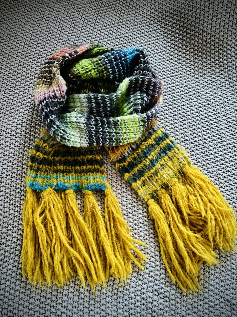 Der „Schal des Lebens 2025“ war meine Inspiration für das erste Werk in diesem Jahr. Ein kuscheliges Ding aus Bomba, Basta und die gute, alte Cool Wool. Einfach Halbpatent gestrickt und jede 2. Reihe das Garn gewechselt. So schön schnell und einfach.