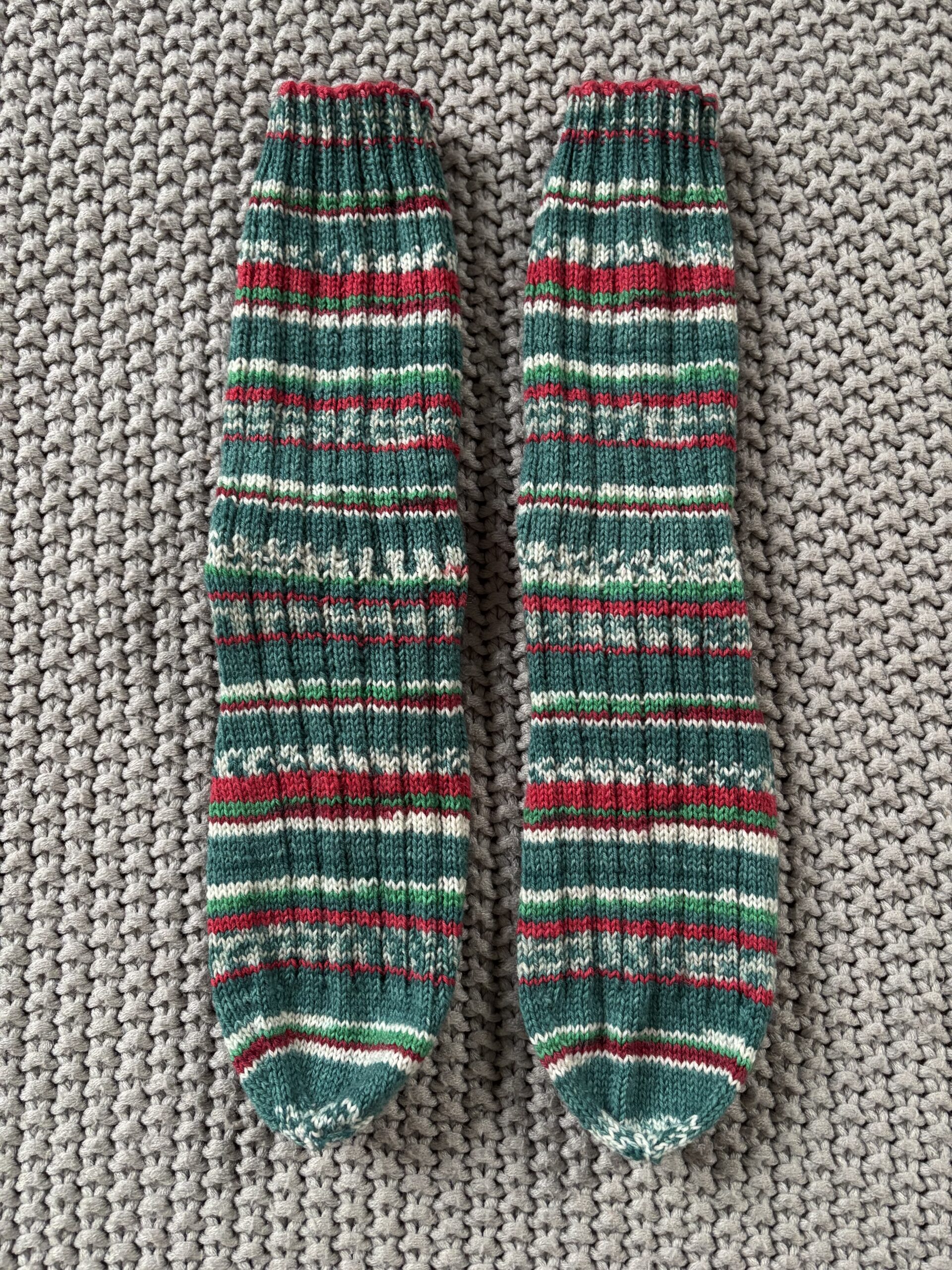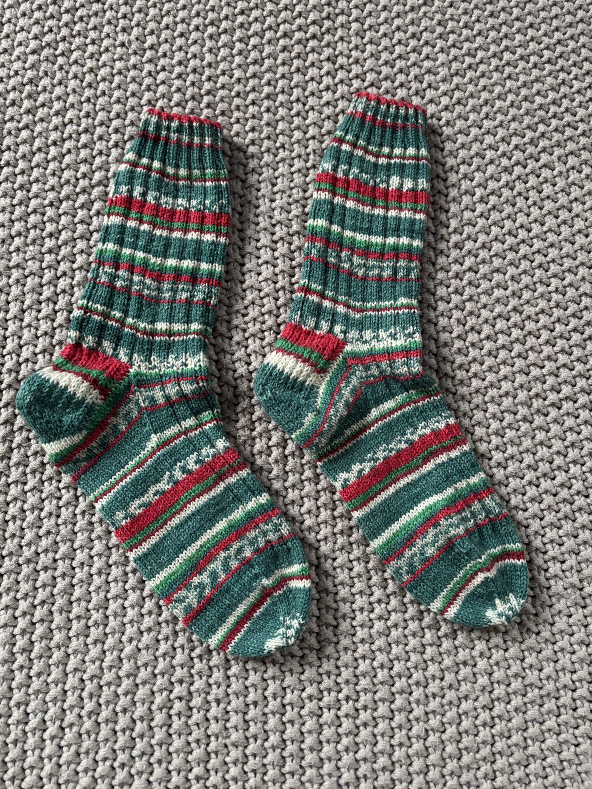 Selbst gestrickte Socken für warme Füße aus „Meilenweit Christmas Edition – Die Sockenwolle“. Das Unikat ist so bunt wie das Leben.